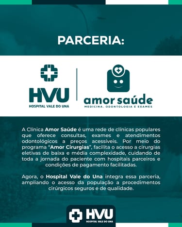 O Hospital Vale do Una tem orgulho de ser parceiro da Amor Saúde, rede de clínicas populares que oferece consultas médicas, exames e serviços odontológicos a preços acessíveis. Por meio do programa AMOR CIRURGIAS, essa parceria amplia o acesso da população a cirurgias eletivas de baixa e média complexidade, com segurança, qualidade e acompanhamento completo do paciente — do pré ao pós-operatório.